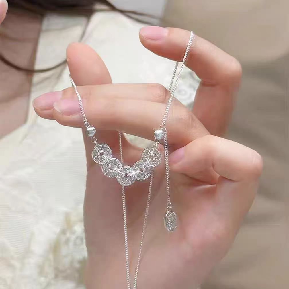 2025 New Silver Necklace Crushed Ice Five Emperors Money Clavicle Chain Bracelet Women's Accessible Luxury Exquisite Versatile High-End Gift