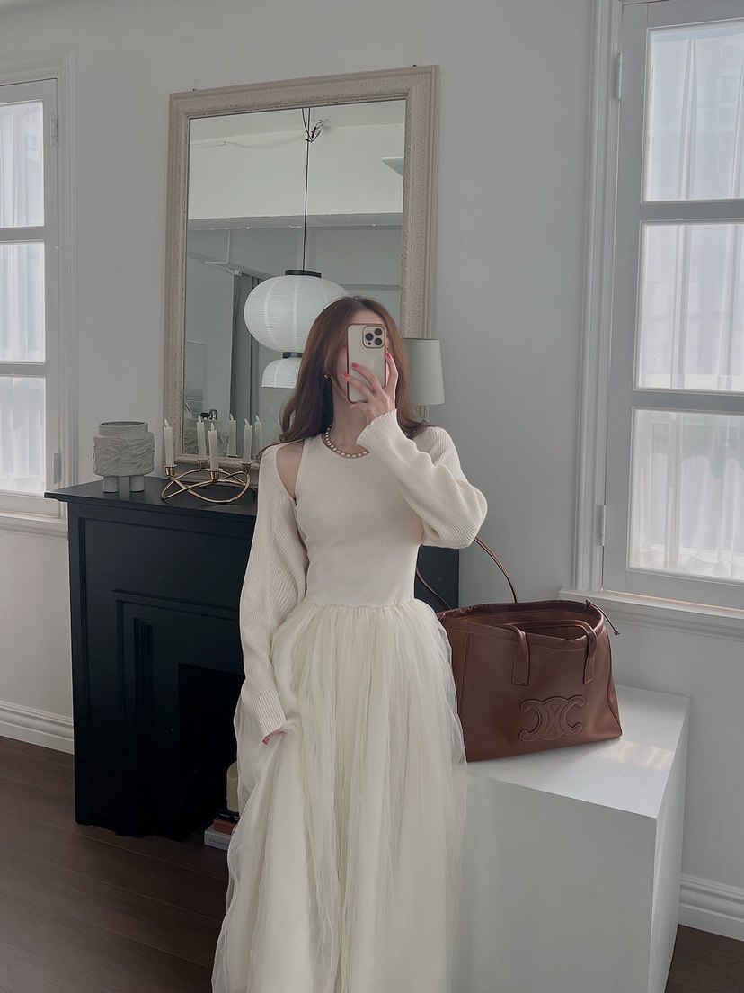 The Plan Korean Knitted Ballet Style Camisole Dress for Women, Autumn Pure Desire Tea Break High-End Spliced Tulle Dress
