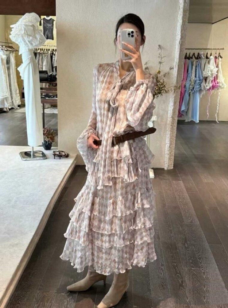 Distinguished from the Market, Cs's New Autumn and Winter Rayon Plaid Lace-Up Ruffled Long Skirt Long-Sleeved Tiered Dress