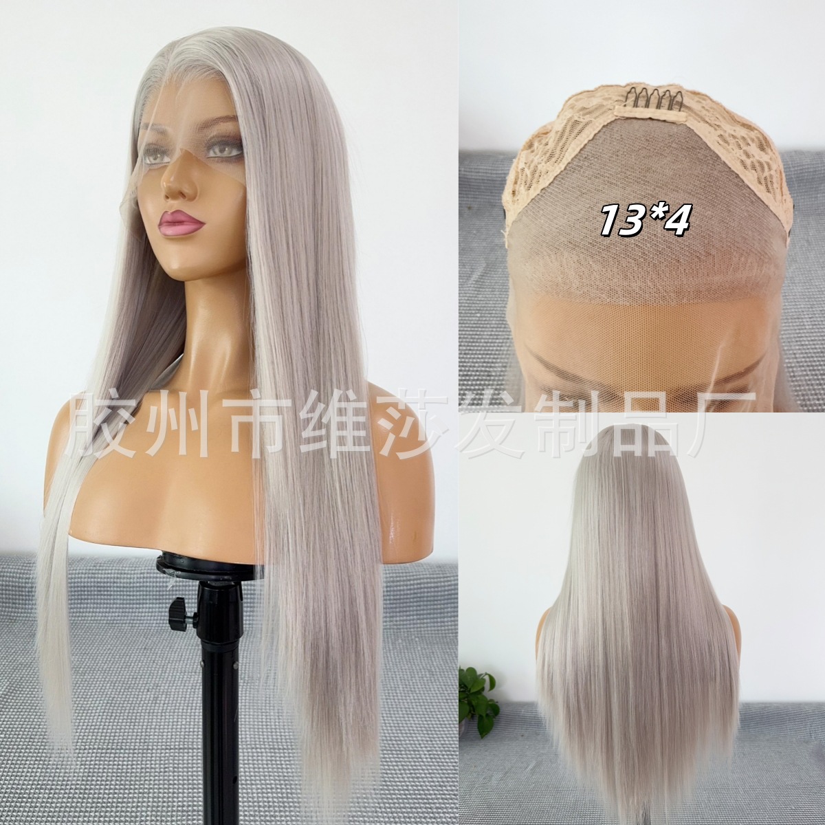 European and American light gray Front Lace Chemical Fiber Straight Hair Daily Natural Simulation Wig Full Head Cover Fashion Long Simulation Hair