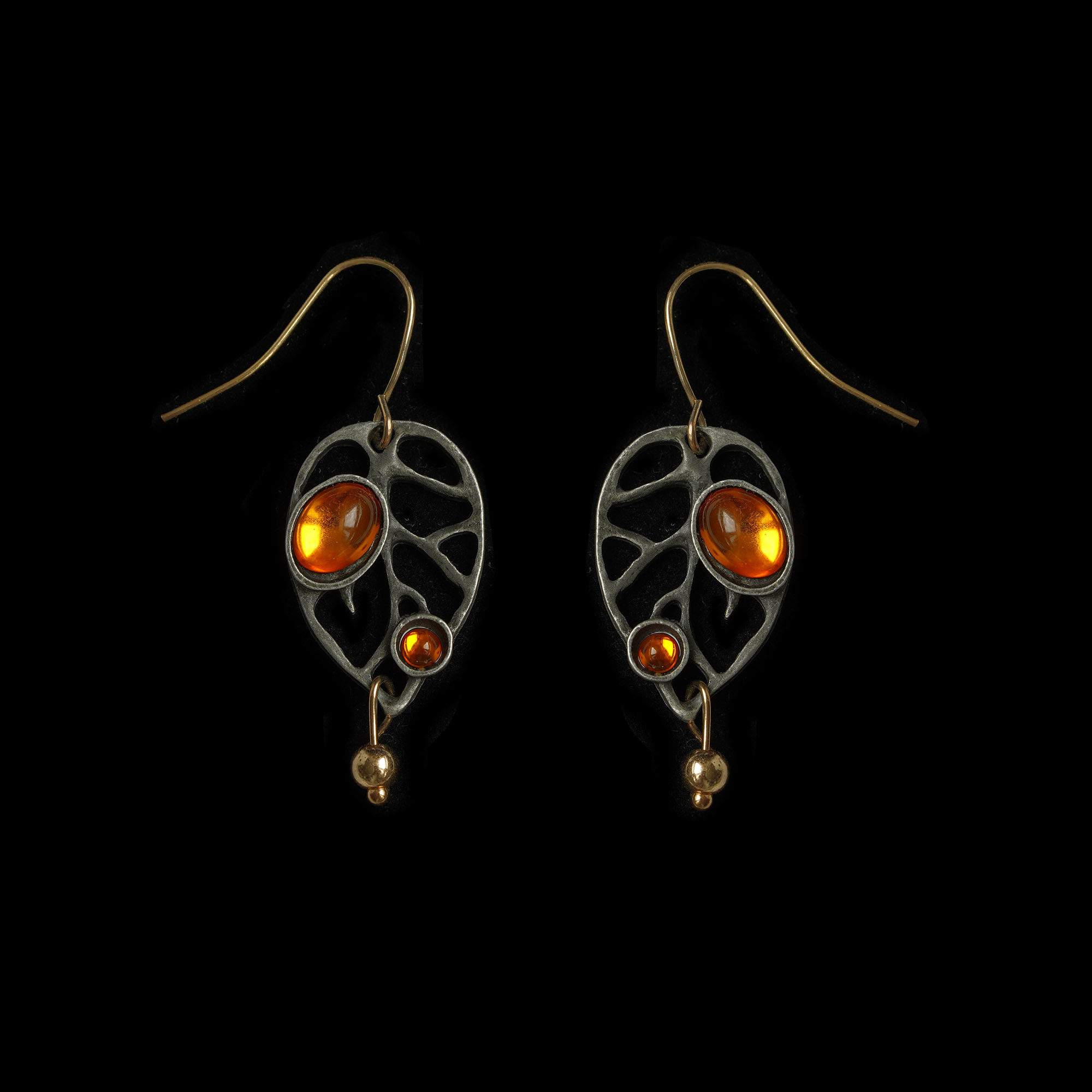 Vintage Ancient Silver Leaves, Orange Gemstones Retro Earrings