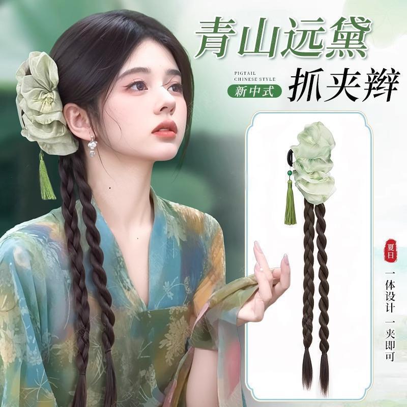 New Chinese-Style Wig Braid Claw Clip for Women, Realistic Ink Wash Tassel Twist Long Braid Hair Accessory, Can Be Half-Tied into a Ponytail