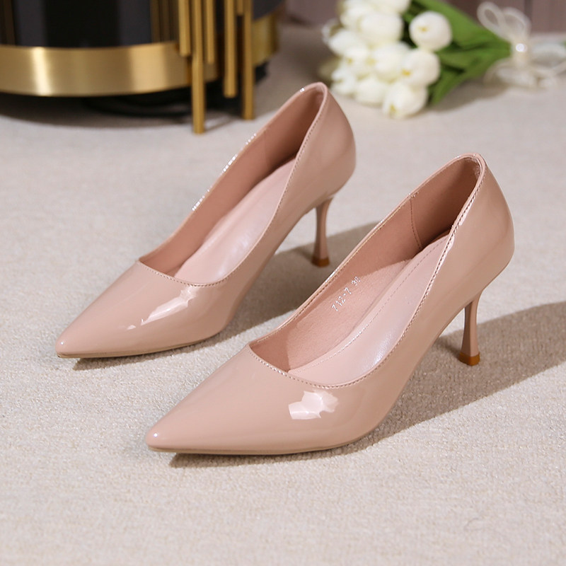 Relaxed Shoes~ Commuting Nude-Colored High Heels for Women, 7cm Stiletto Heels That Are Comfortable, Patent Leather Pointed Toe, Elegant Work Shoes