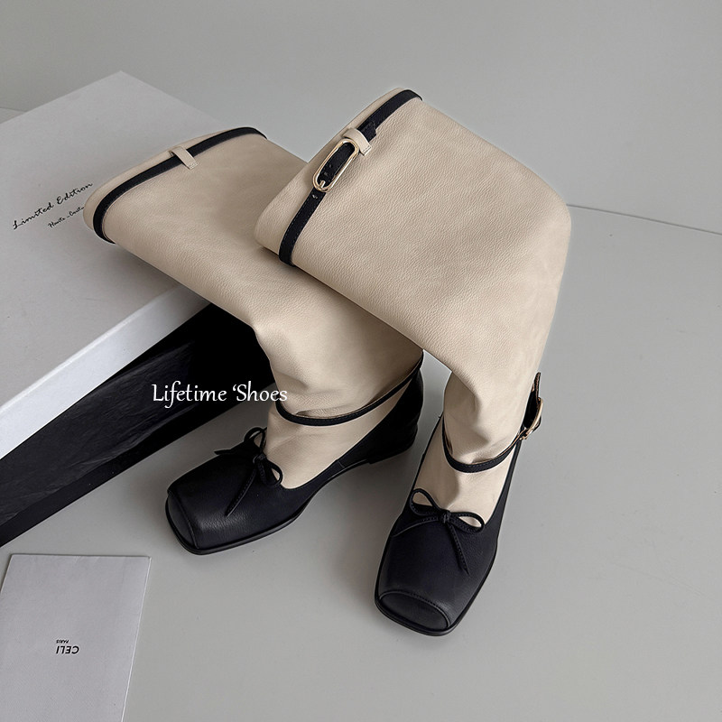 Lifetime'Shoes 4.5cm Niche Sweet and Cool Bow-Knot Square-Toe Patchwork High-Tube Riding Fashion Boots