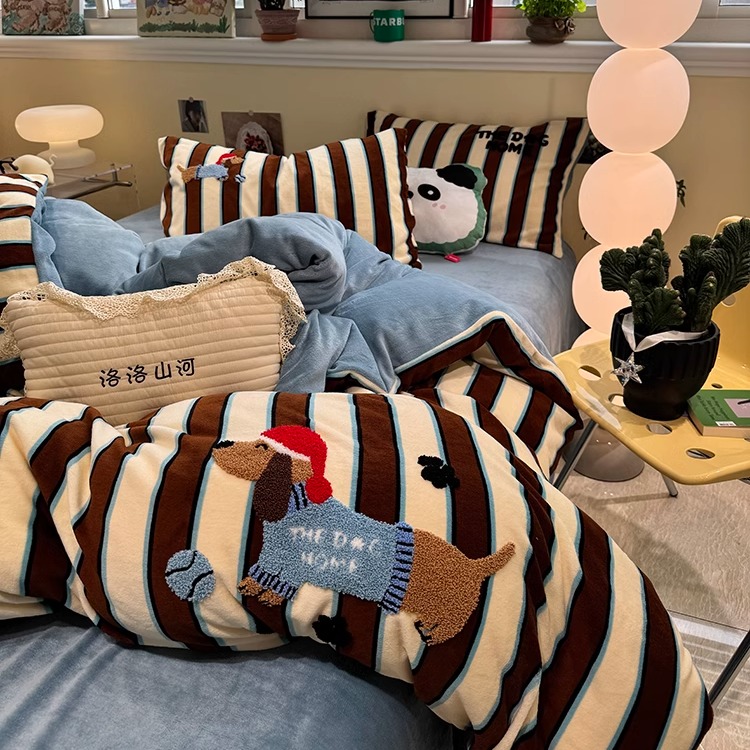 ins Simple Cream Coffee Color Mixed Striped Dachshund Towel Embroidery Four-Piece Set High-End Milk Velvet Thickened for Warmth