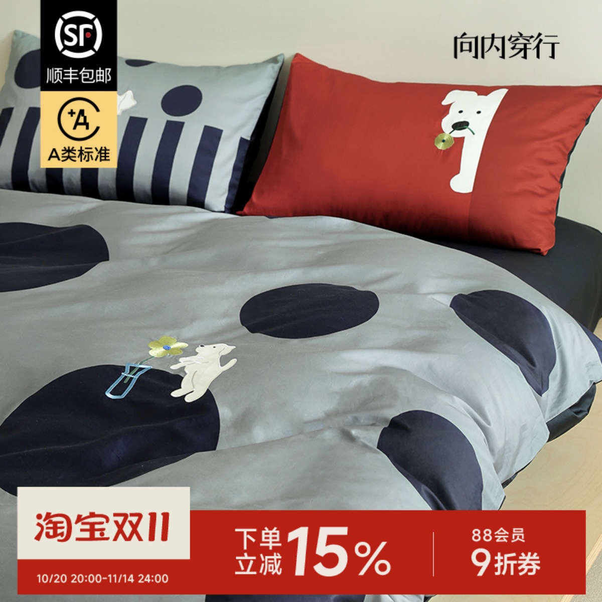 Inward Journey A-Class 100% Cotton Polka Dot Puppy Embroidery Four-Piece Bedding Set Pure Cotton Bed Sheet Fitted Sheet Niche Bedding