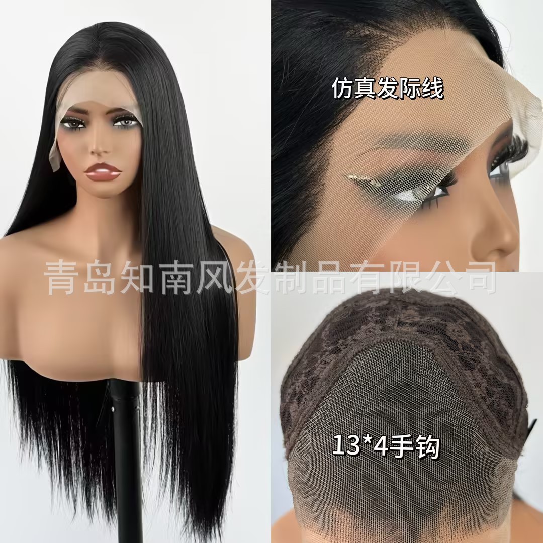Black Synthetic Wig with Hand-Tied Lace Front 13X4 High-Temperature Fiber Long Straight Hair Women's Full Wig Coswigs