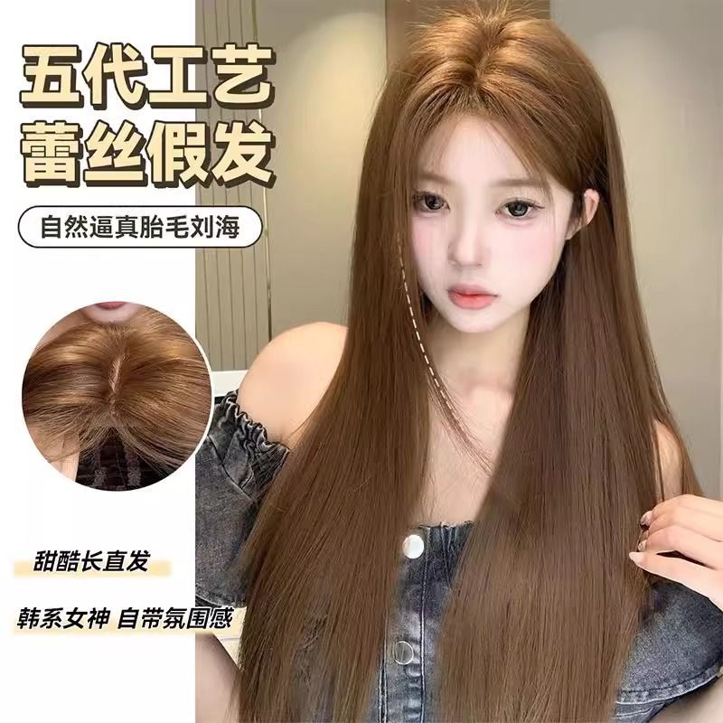 Wig Female Internet Celebrity Forehead Lace Female Medium Parted Bangs Long Straight Hair Natural New Face-Shaping Seamless Invisible Full Headgear