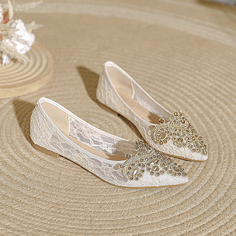 Main wedding dress engagement shoes Women's Flat non-tired feet bridal shoes 2024 New apricot mesh plus size single-layer shoes women 4143