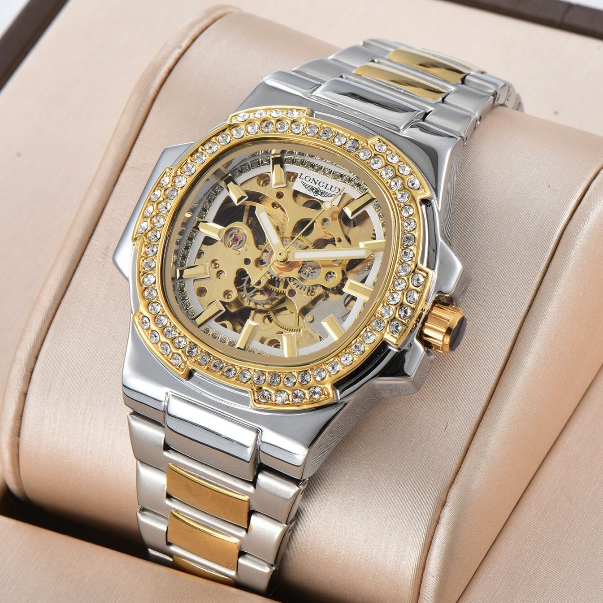 LONGLUX/龙力士自动镂空机械表跨境专用带石仔时髦男女通用钢带表