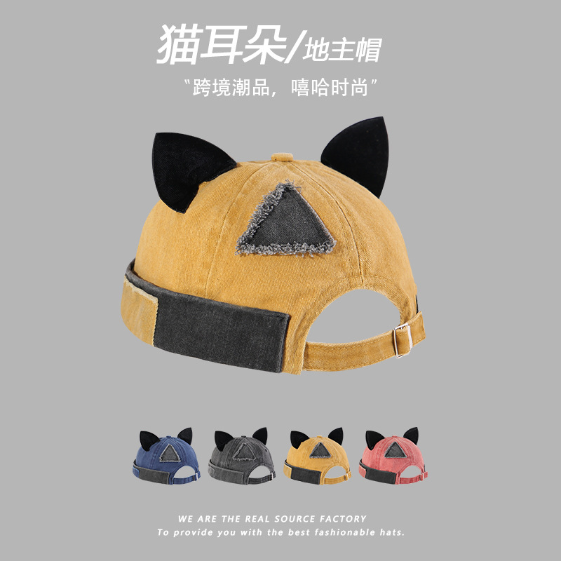 Vintage Washed Fox Ear Landlord Hat for Women, Trendy Street Style Patchwork Melon Cap for Men, Brimless Beanie