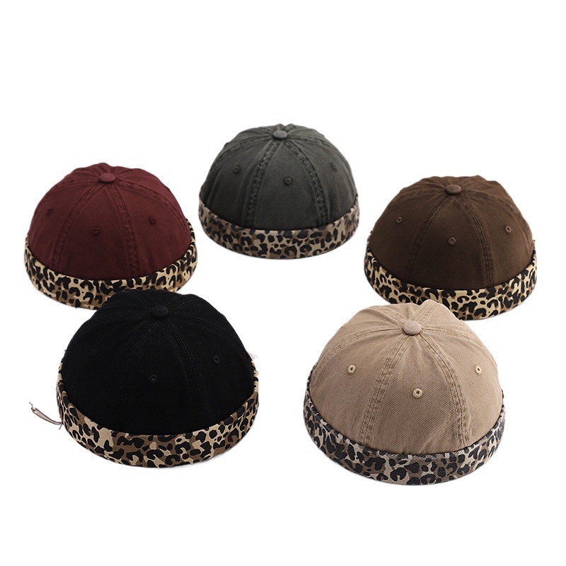 American-Style Leopard Print Patchwork Washed Vintage Landlord Hat for Men, Brimless Hip-Hop Beanie for Women, Outdoor Sports Melon Cap