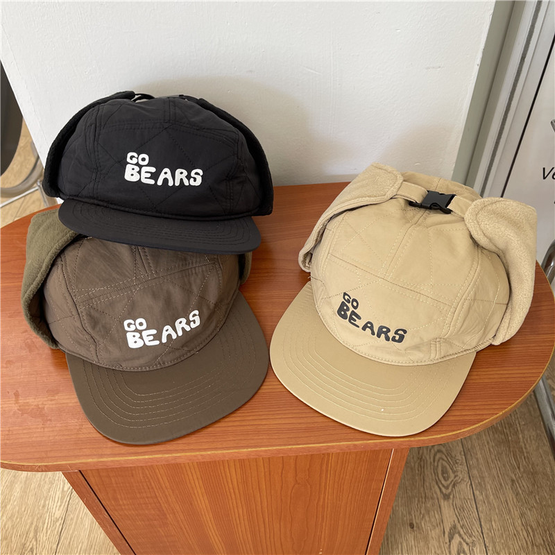 Korean style flat brim letter baseball cap women's all-match men's fleece-lined warm ear protection Lei Feng hat parent-child pilot hat