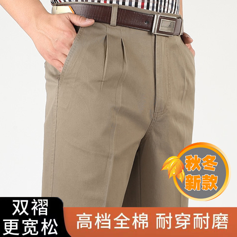 Autumn and Winter Thick Middle-aged Pure Cotton High Waist Men's Pants Middle-aged and Elderly Men's Casual Pants Double-pleated Loose Fat Dad Pants