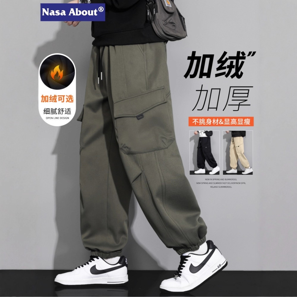 Nasa Cargo Pants Men's Autumn and Winter Loose Plus-Size Thickened Fleece Multi-Pocket Casual Pants