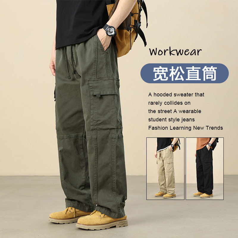 Men's Pants Spring and Autumn Pure Cotton Straight Loose Large Size Cargo Pants Trendy American Style Wide-Leg Casual Long Pants Slimming