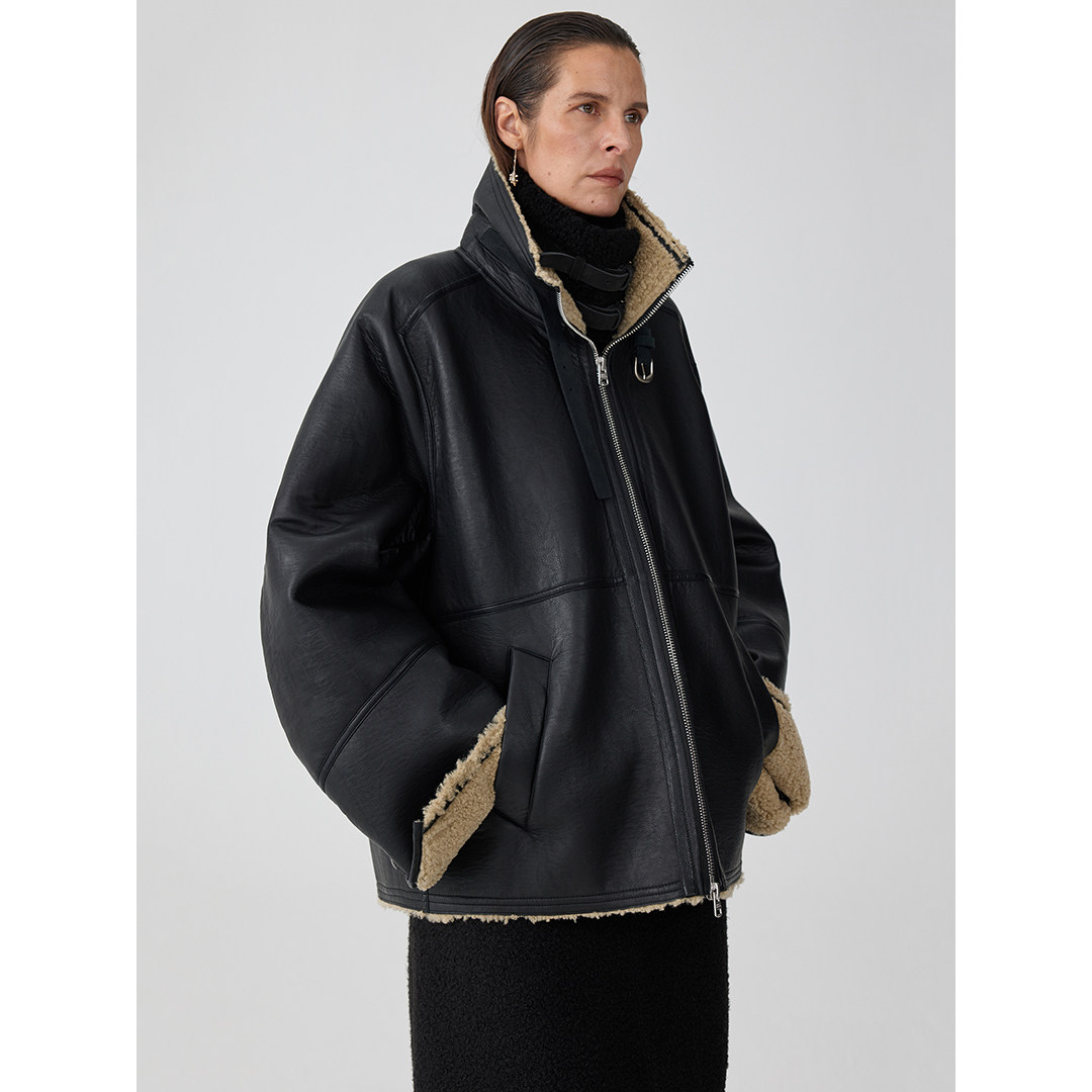 Simple Project*Leather Shearling Jacket Leather Shearling Jacket with Integrated Fur Silhouette