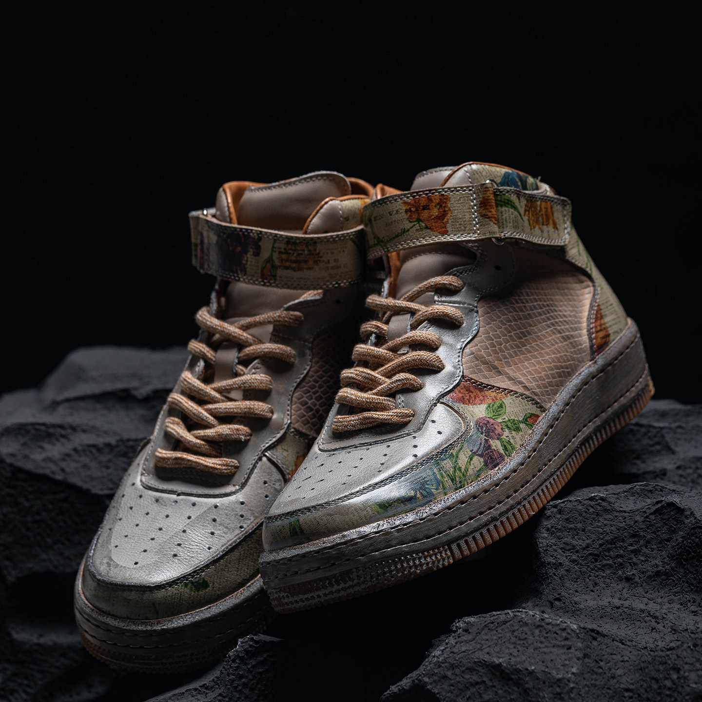 Zhou Ying Printed Leather Patchwork Mud-Dyed Distressed High-Top Sneakers, Sports Casual Shoes, Fully Hand-Stitched, Wasteland Style