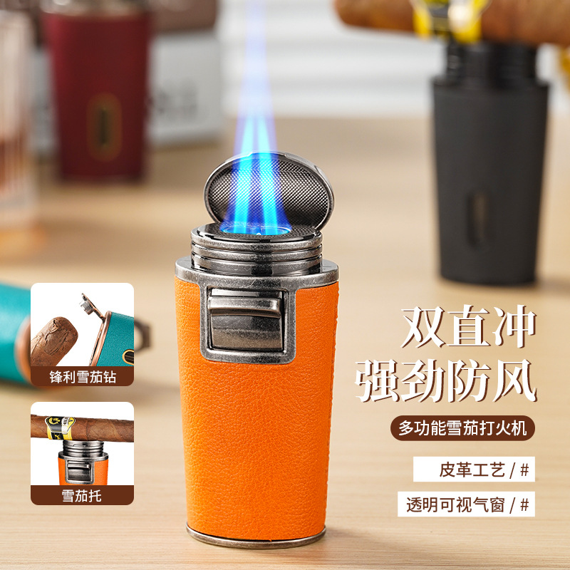 New Leather-Textured Metal Straight-Through Lighter Creative Men's Blue Flame Windproof High-Power Cigar Lighter Foreign Trade Wholesale