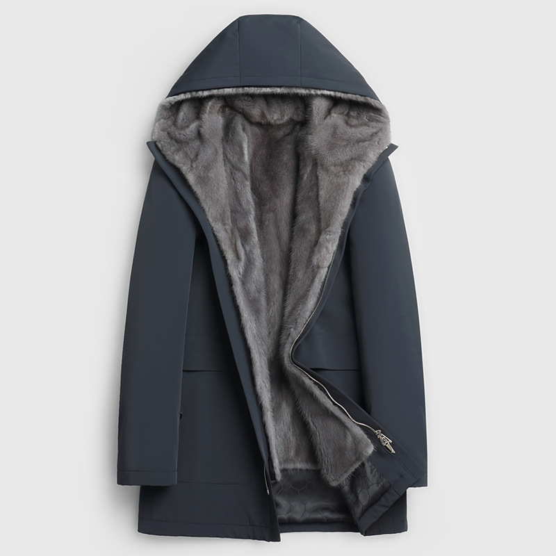 Men's Mid-Length Mink Parka with Hooded Fur Coat, Suitable for Winter Business Attire