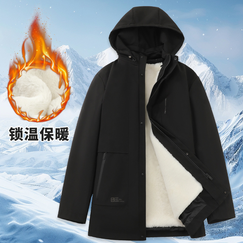 2024 Men's Casual Coat Men's Mid-length Coat Youth fleece-lined Lamb Wool Hooded Coat Waisted Pike