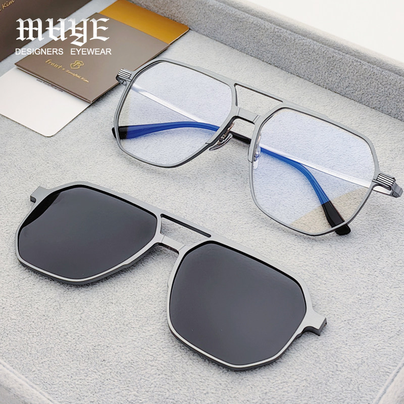 New Men's Large-Face Double-Bridge Magnetic Pure Titanium Myopia Glasses Frame Three-In-One Set with Polarized Sunglasses Clip-On