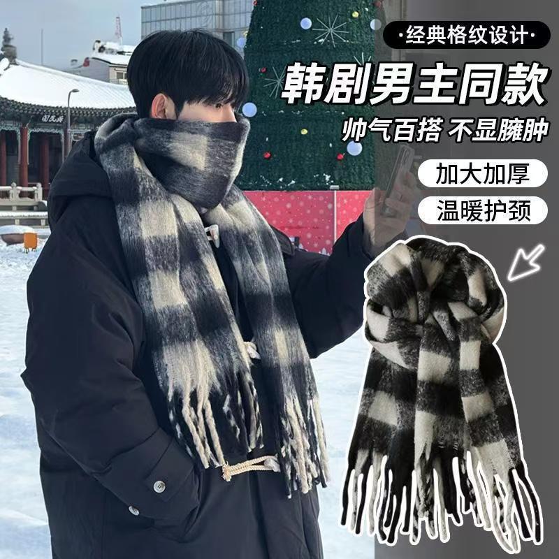 Korean Drama Male Lead Style Scarf, High-End Mohair Black and White Plaid Scarf, Large Shawl, Warm and Thickened Scarf