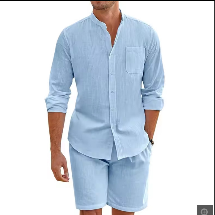 Summer Mens Casual Sets Cotton Linen Shirts+Shorts Sets men