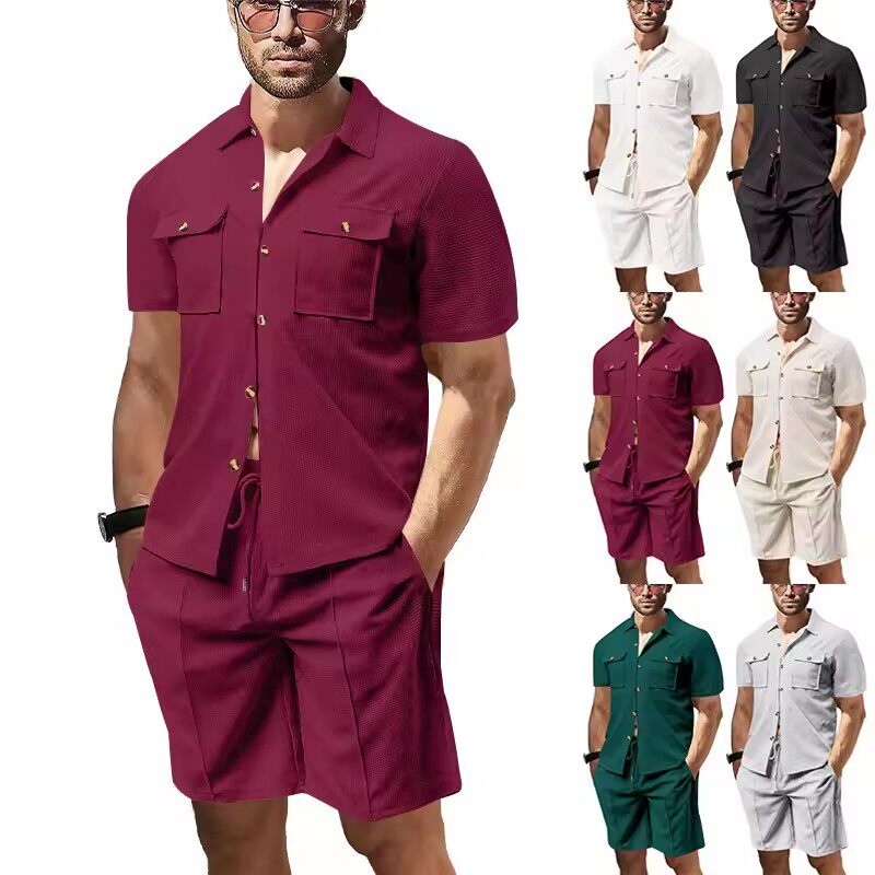 Men's Solid Color Jacquard Short-Sleeved Shirt and Pants Set Men's Suit