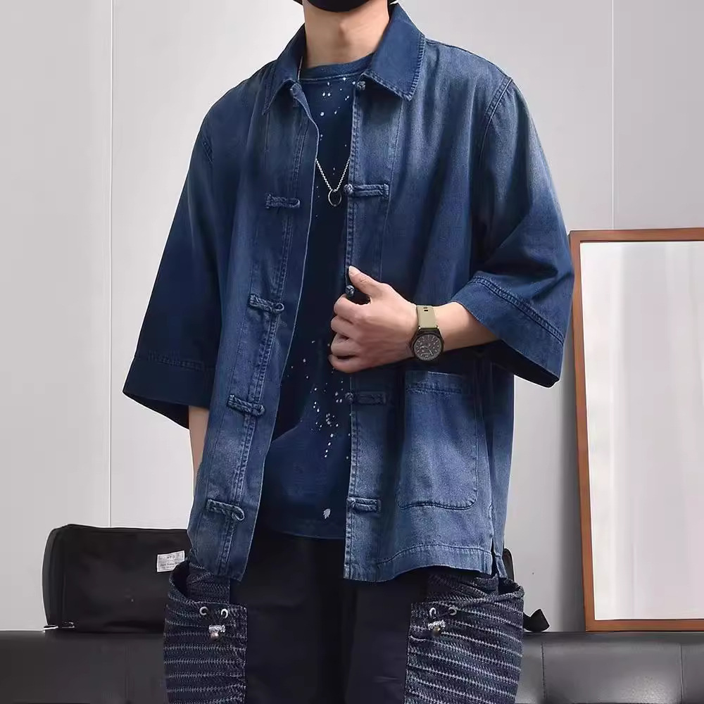 New Chinese Style National Style Short Sleeve Shirt Men's Denim Buckle 2024 Summer New Loose Chinese Tunic Suit Shirt Jacket for Men