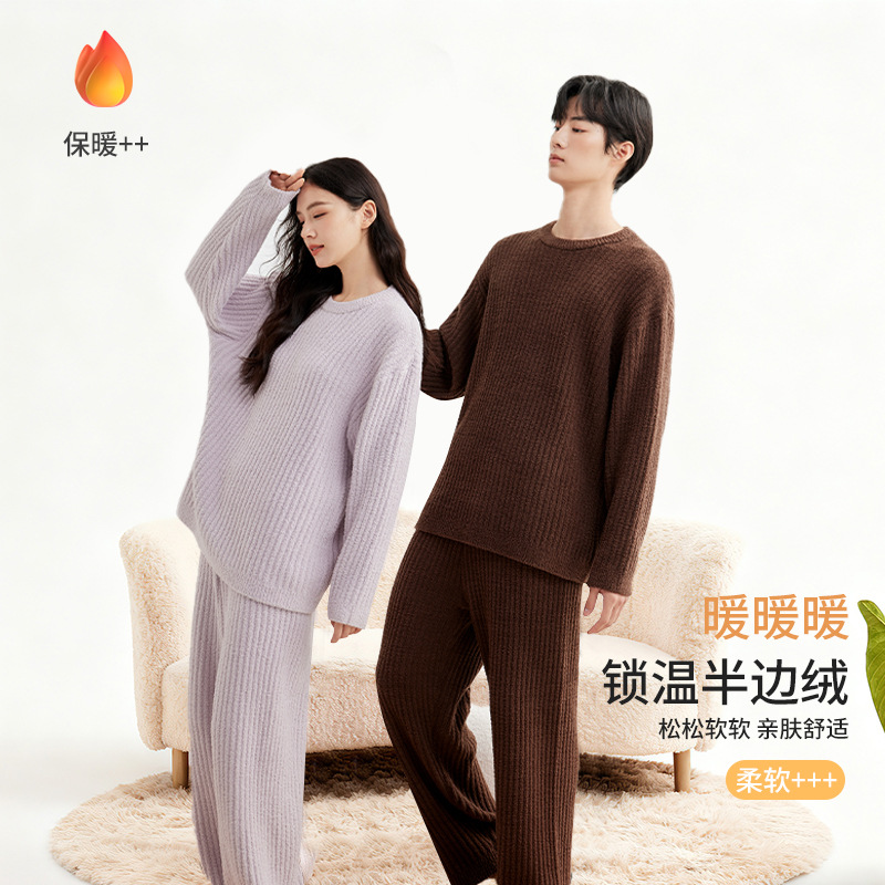 Pullover Ribbed Half-Velvet Pajamas for Women, Thickened and Warm, Autumn and Winter Men's Loungewear, Couple Style