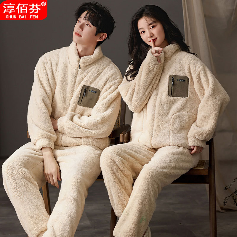 Chun Baifen Couple Pajamas Autumn and Winter Coral Fleece Men's and Women's Thickened fleece-lined Flannel Hooded Winter