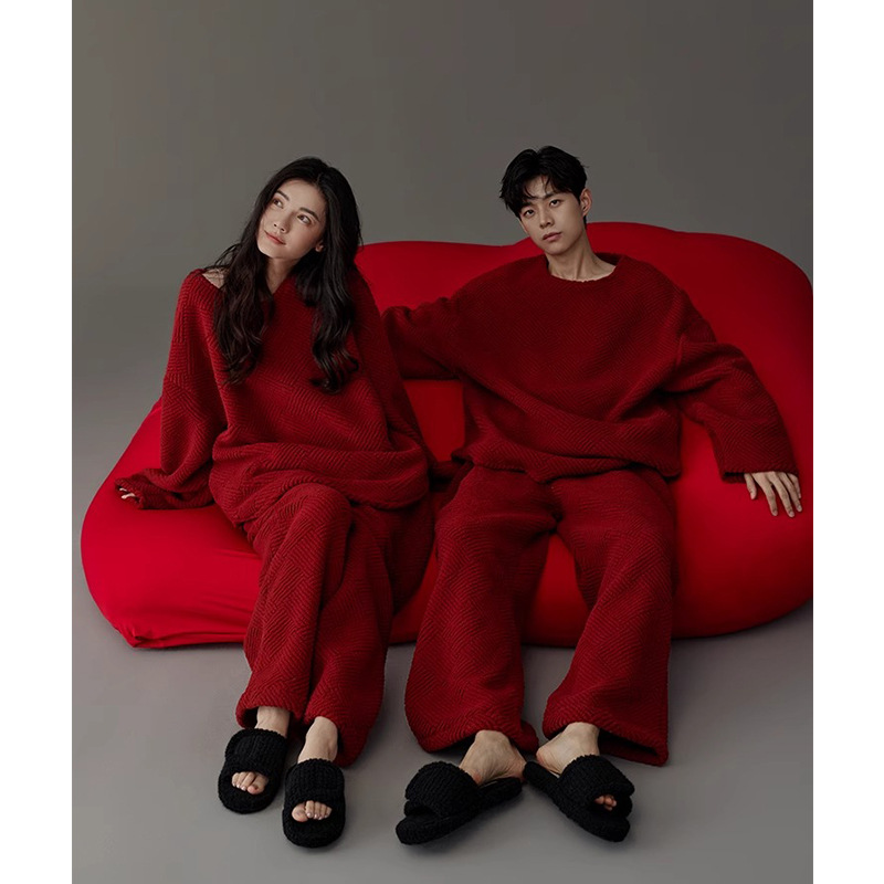 Lushi winter thickened couple coral fleece pajamas suit women's wedding festive birth year Big Red homewear men
