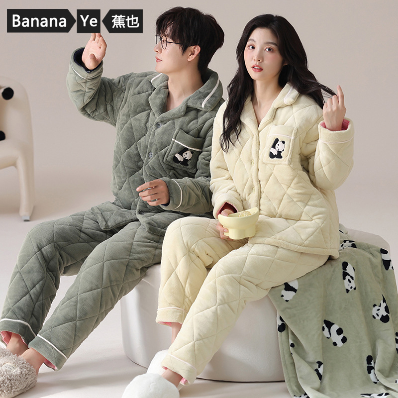 Three-layer Quilted Coral Fleece Couple's Pajamas Autumn and Winter Women's Thickened Fleece Suit Men's Home Clothes