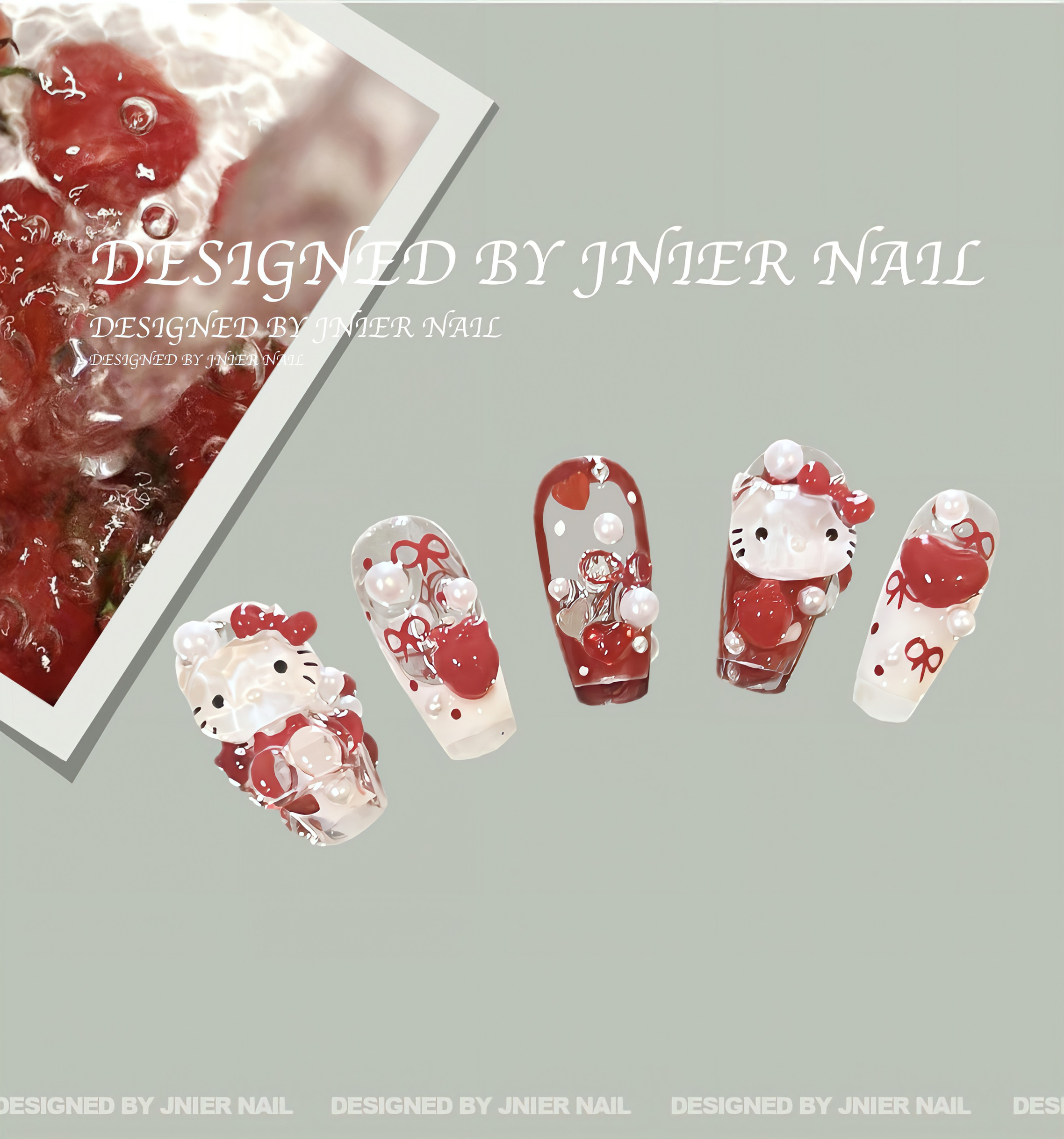 Jnier Nail|"Hellokitty Strawberry Jam” Cute Hand-Painted Classic Red and White Kitty Press-On Nails