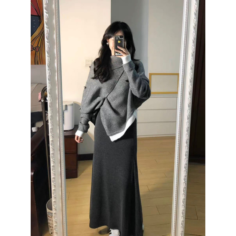 A set of ootd wear small style fashion western style gray sweater tutu skirt two-piece women's 2025 spring