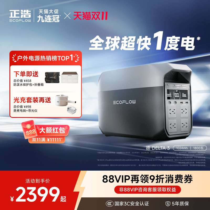 Zhenghao Ecoflow【New Product 1 Kilowatt-Hour】Delta3 Outdoor Portable Power Station 220V Fast Charging 2200W High Power Lithium Iron Phosphate Portable Large Capacity Car-Mounted Self-Driving Camping Power Outage