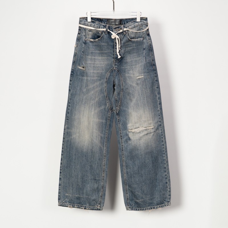 No Faith Studios Nfs Washed Distressed Whiskered Lace-Up Denim Pants Handmade Ripped Wide-Leg Pants