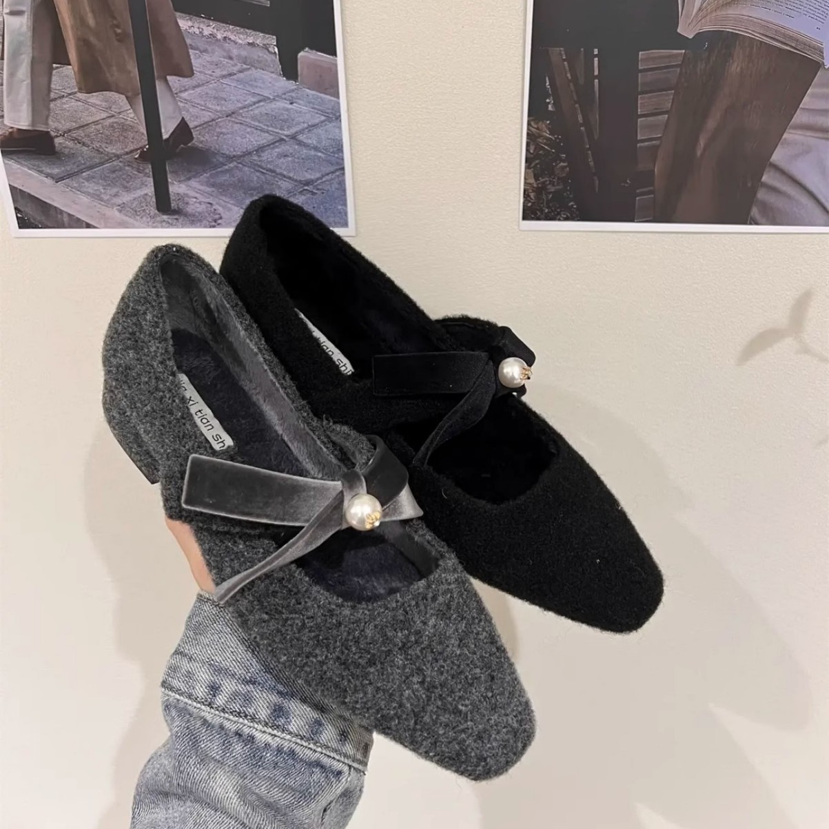 French Style Thick Heel Grey Woolen Single-layer Shoes with Skirt Evening Shoes Women's Winter fleece-lined Bow Mary Jane Mao Shoes