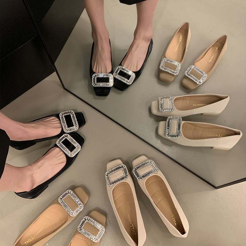 2025 New RV Silk Satin Rhinestone Shallow Mouth Comfortable Ladyshoes Thick Heel Square Head Single Shoes Women's Square Buckle plus size Women's Shoes