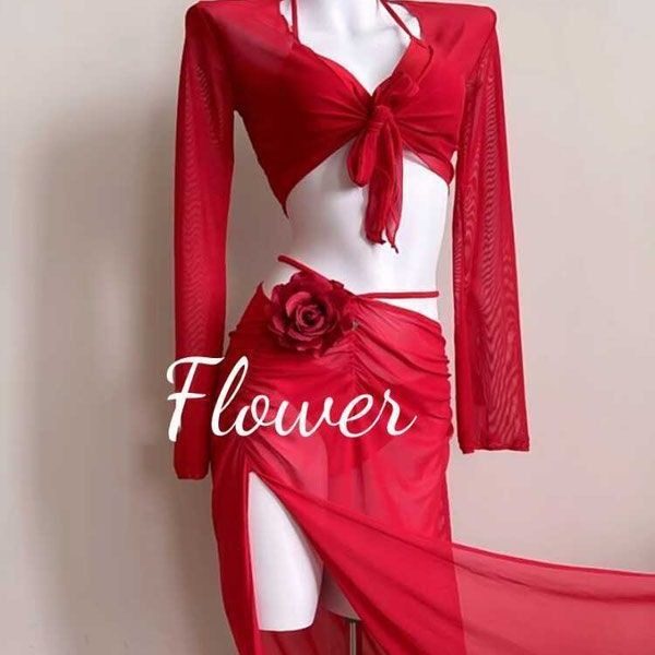 【Cinnabar Spot】New Sexy and Skin-Brightening Bikini Four-Piece Set in Bright Red with Long Sleeves for Vacation and Hot Spring Bathing