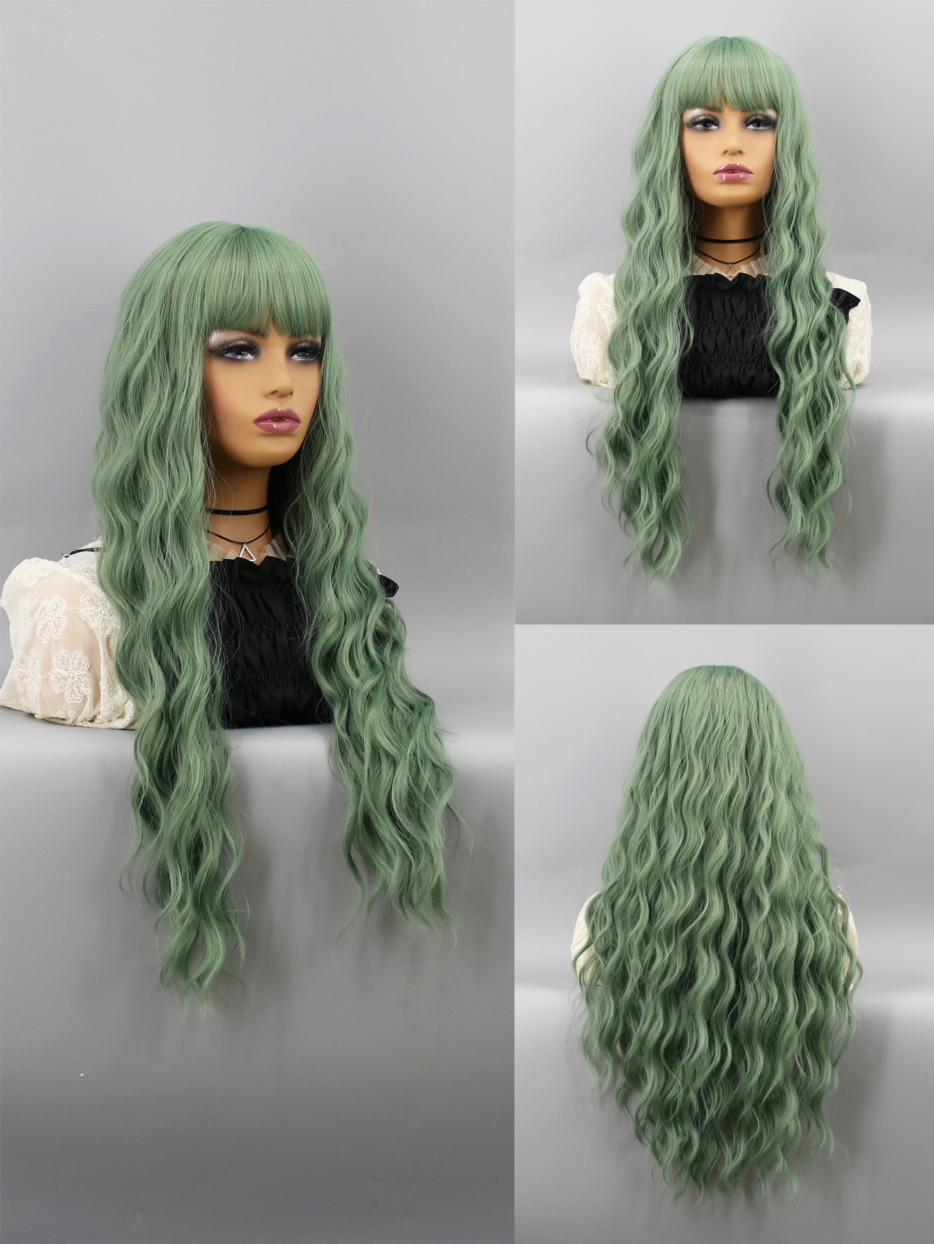 New cross-border Amazon neat bangs long wave fashion synthetic high temperature silk European and American wig women's full head cover wholesale