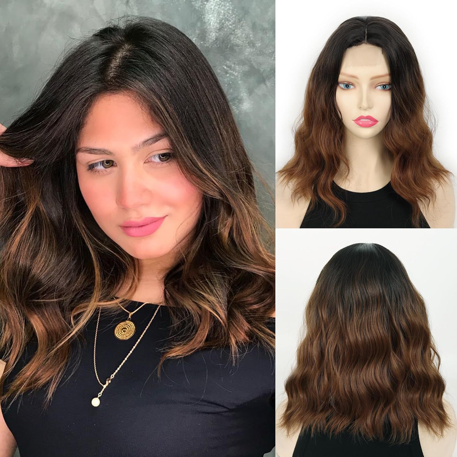 Women's Medium-Length Wavy Synthetic Fiber Wig 14inch Amazon Hot T-Type Lace Suitable for Daily Wear