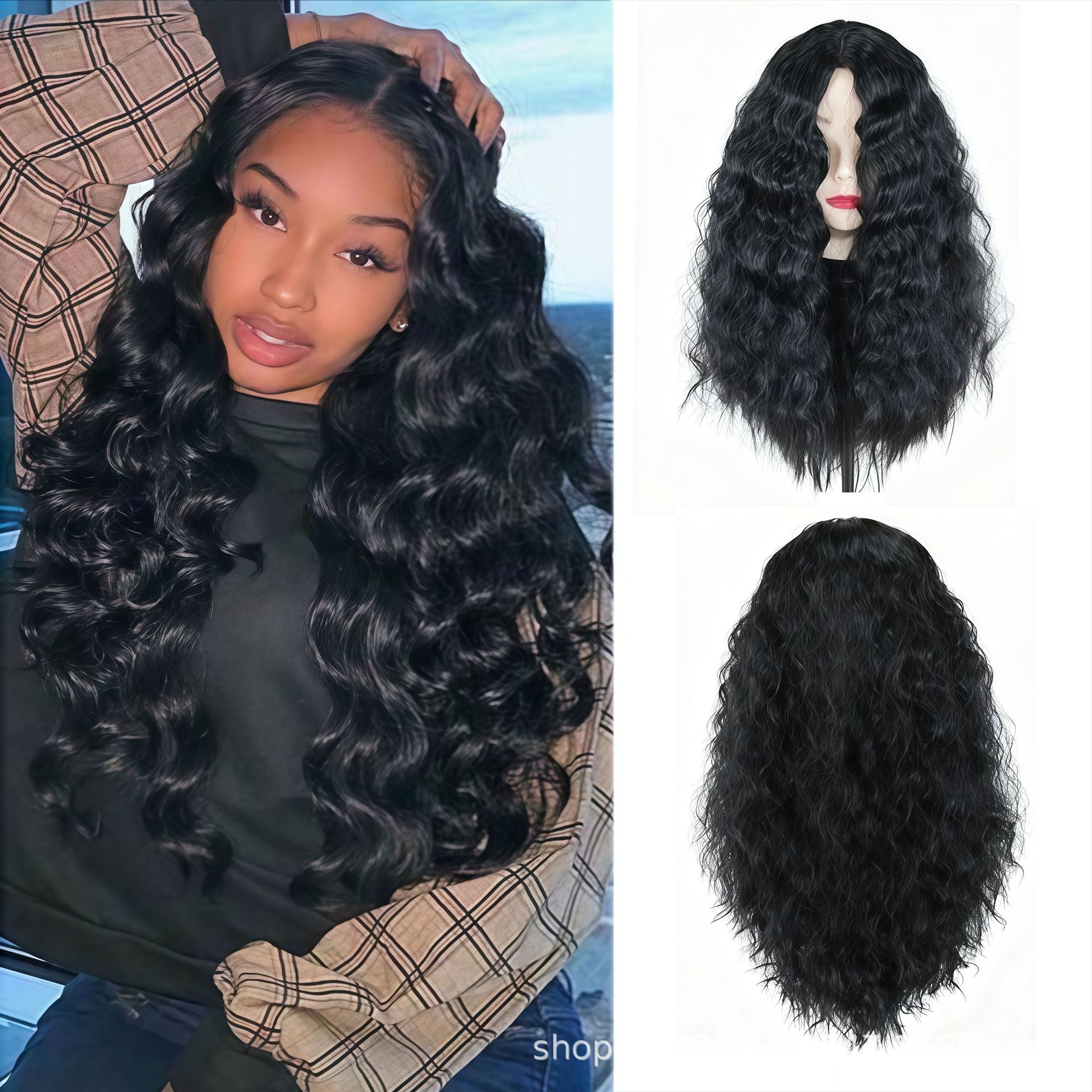 Hand-Woven Black Long Curly Hair Ocean Wave Lace Front Wig Synthetic Natural Black Long Wig