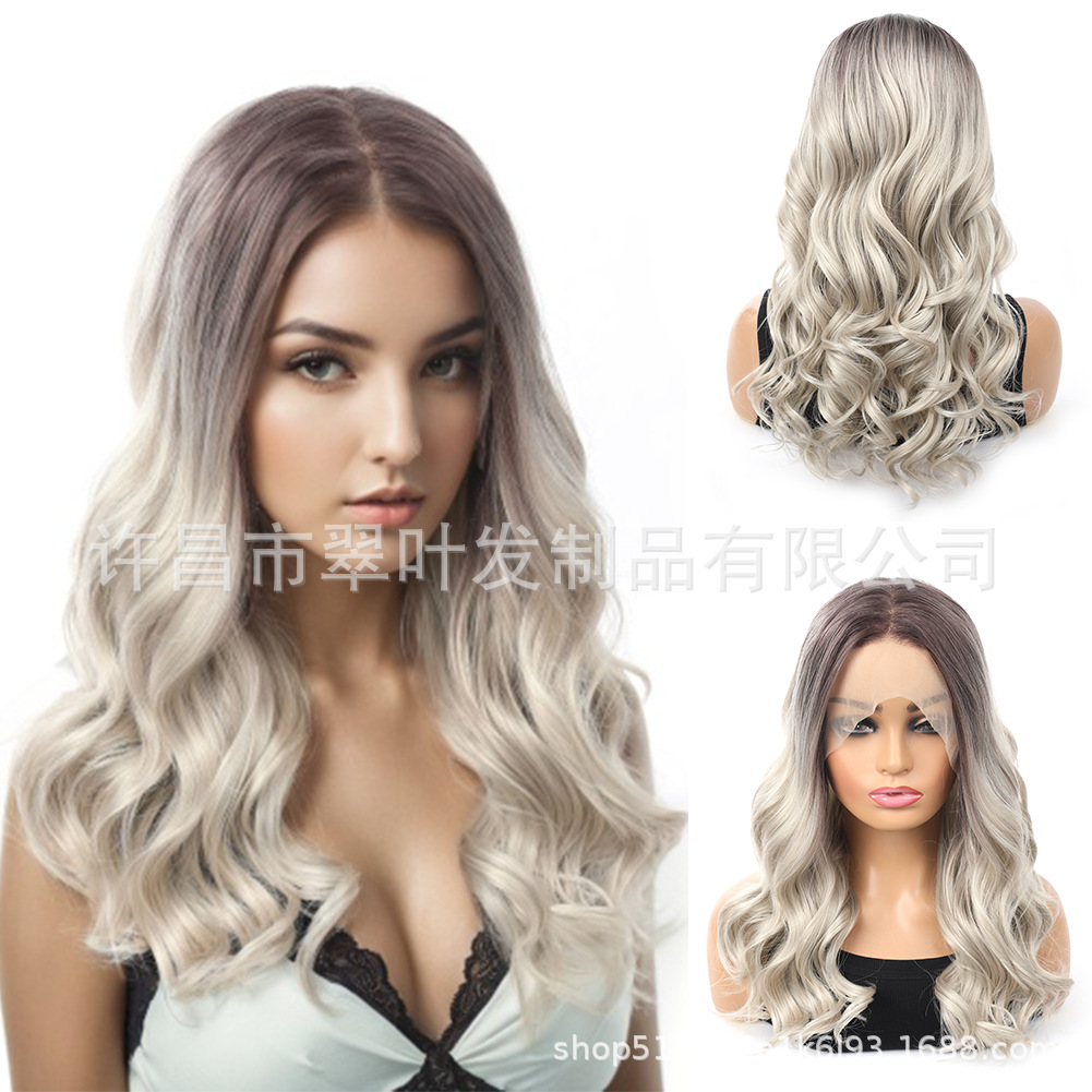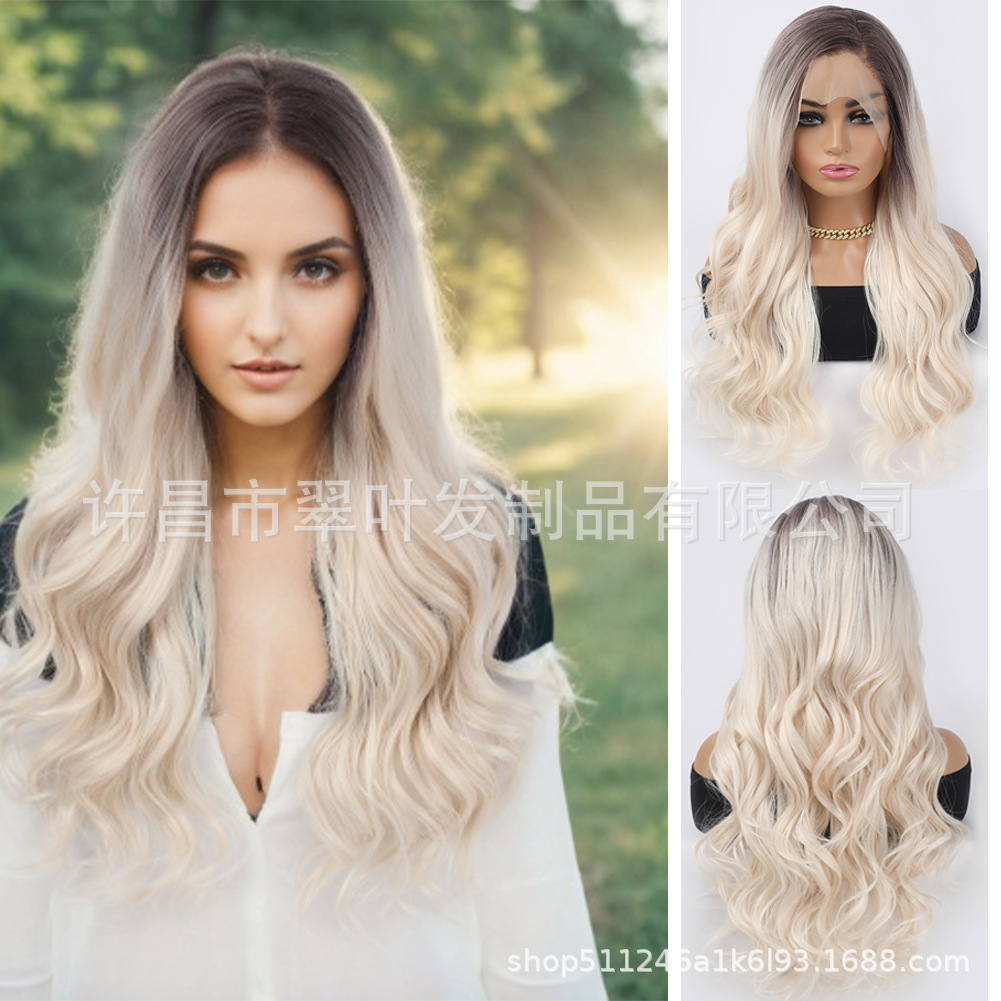 Cross-border European and American wig front lace long curly hair wig light gold Black Gradient synthetic high temperature silk role-playing hair