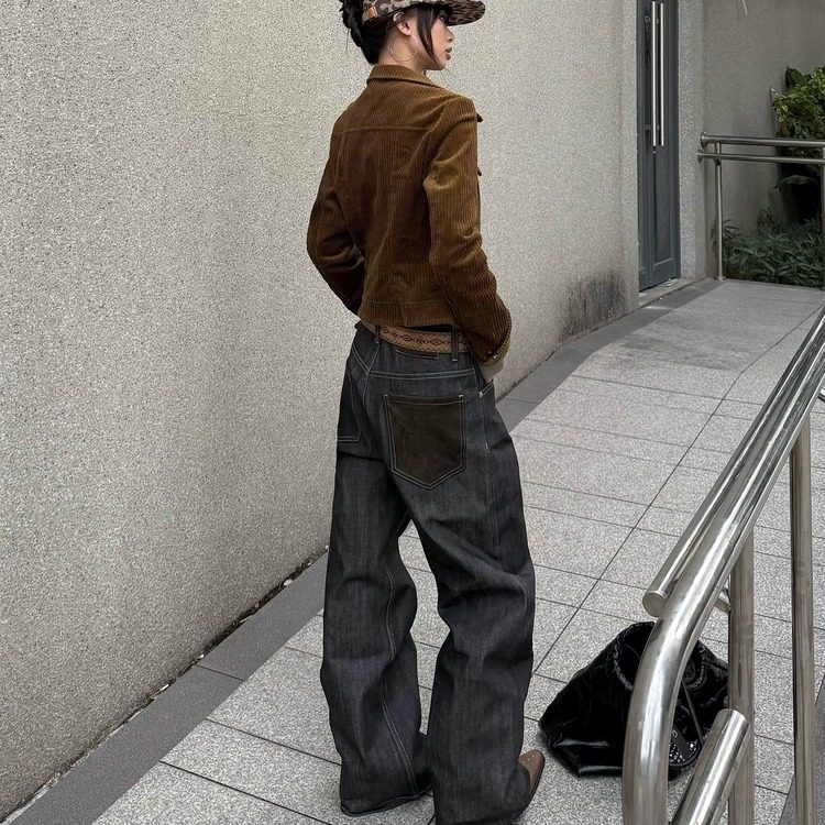Zcnt-Original Versatile Straight-Leg Vintage Washed Patchwork Design Distressed Denim Cargo Pants