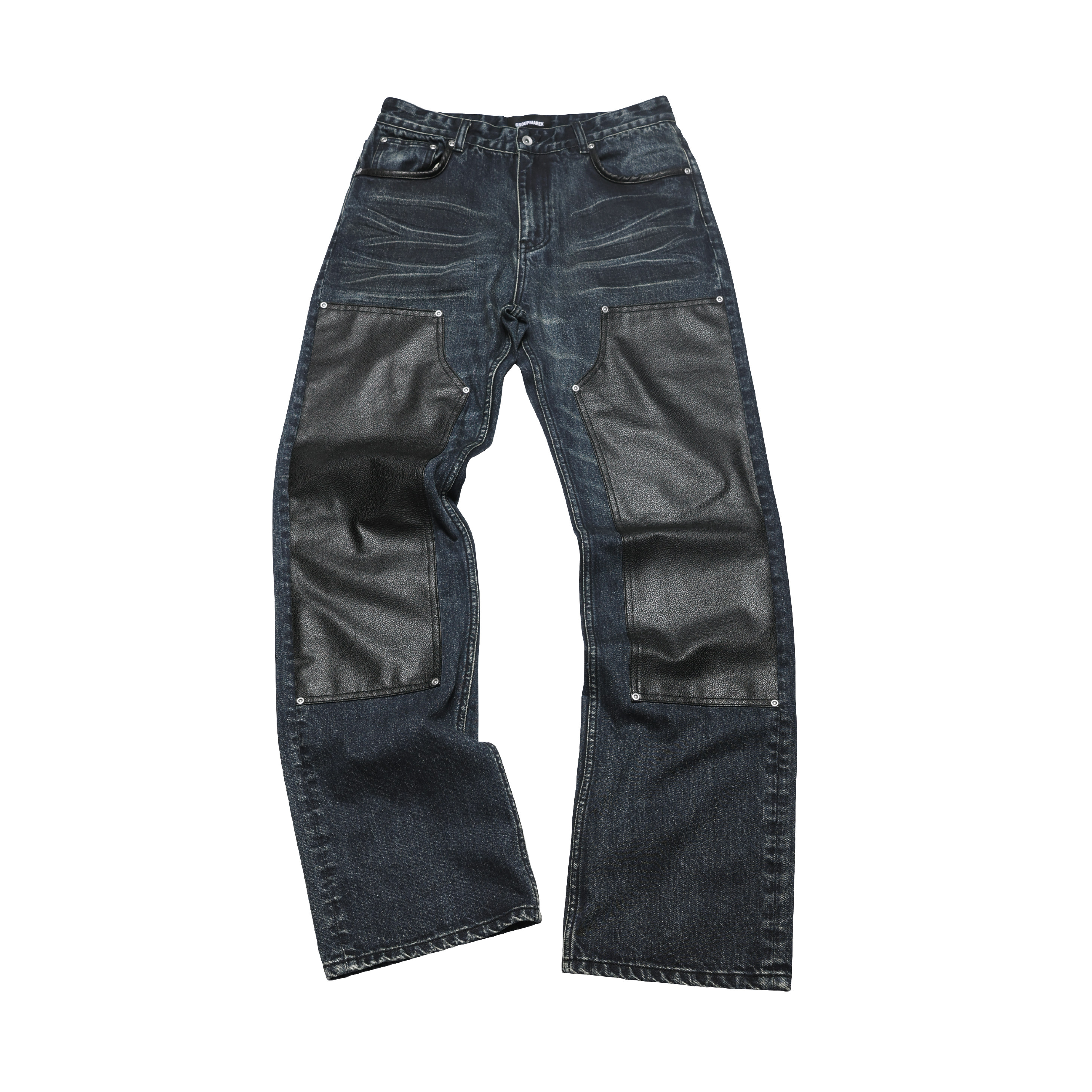 Groupmarek[Gmk] Dark Blue Washed Leather Patchwork Double-Knee Patchwork Straight-Leg Denim Pants with Three-Dimensional Whiskers