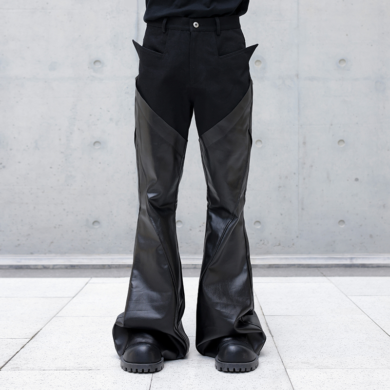 Chrysomallon Trendy Coated Waxed Men's Flared Split Deconstructed Patchwork Casual Bell-Bottom Pants Wax Pants Leather Pants