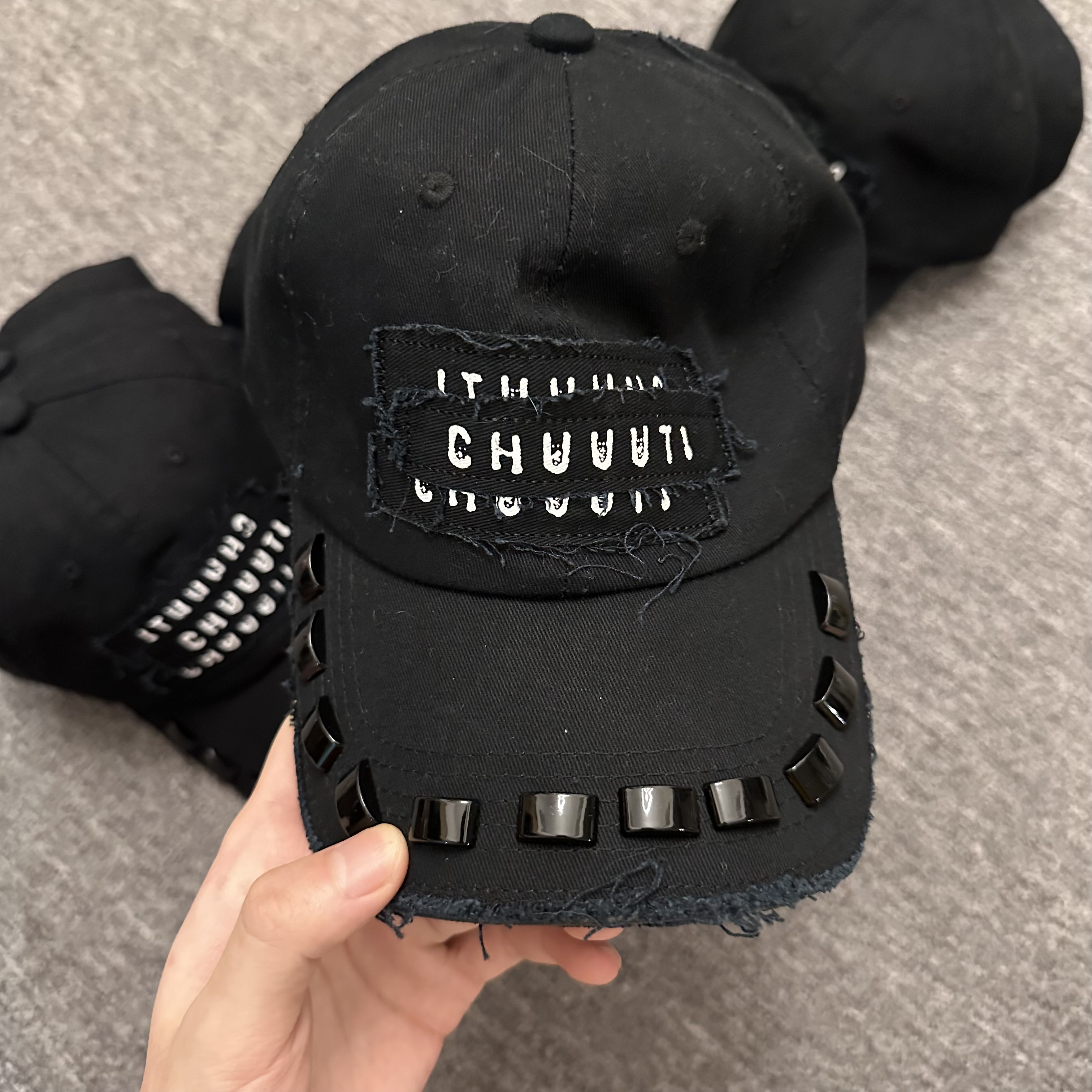 In Stock: Undercover 06Ss Black Studded Baseball Cap, Distressed and Frayed, with Tassel Patches