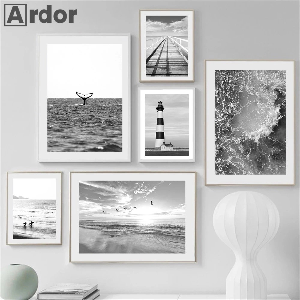 Black White Sea Beach Whale Lighthouse Wall Art Poster Decor